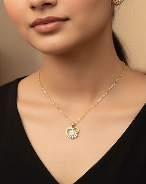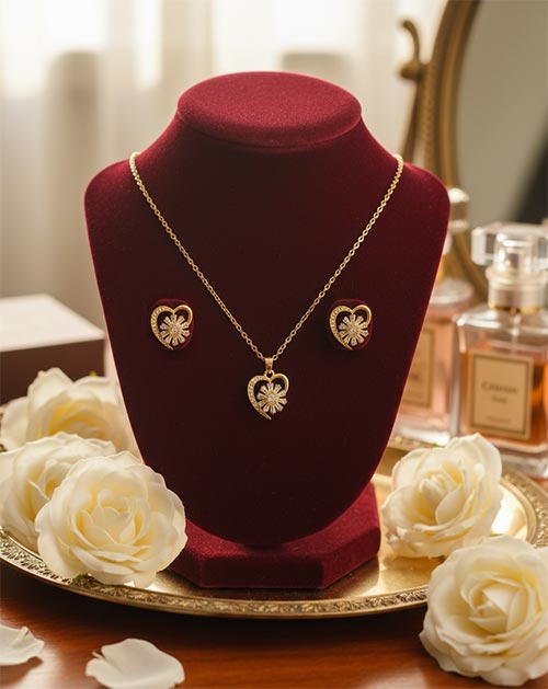 Add timeless elegance to your everyday and occasion looks with the Golden Bloom Heart Pendant Necklace Jewellery Set. Crafted from durable stainless steel and finished with premium anti- tarnish gold plating, this jewellery set features a delicate heart-shaped pendant highlighted with a beautiful floral motif at the center.
