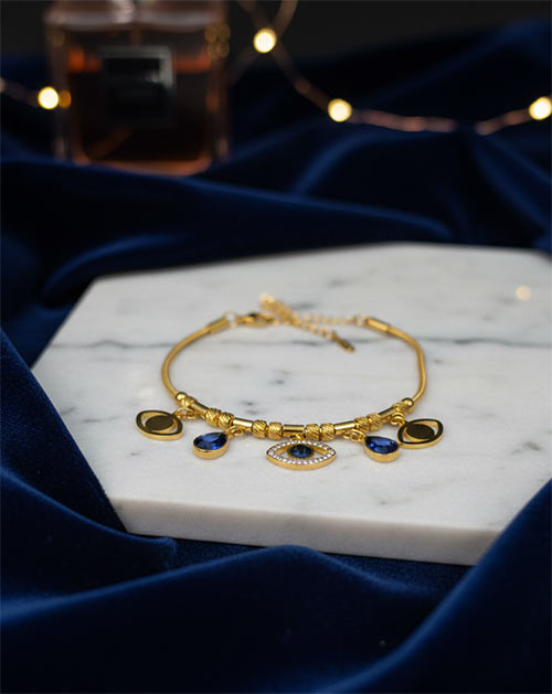 Enhance your jewellery collection with the elegant Blue Evil Eye Teardrop Crystal Anti-Tarnish Gold Plated Bracelet. Designed with a protective evil eye charm and deep blue teardrop crystals, this bracelet adds a graceful and meaningful touch to any outfit. Crafted from premium stainless steel with a high-quality gold-plated finish, it is anti-tarnish, durable, and comfortable for styling, festive occasions, parties, and thoughtful gifting.
