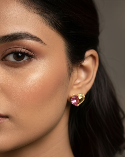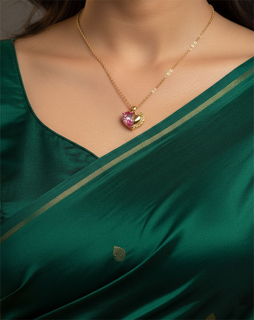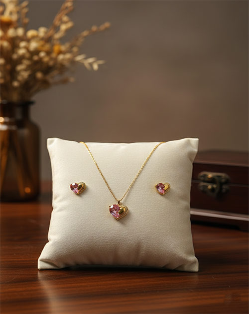 Elevate your festive and celebration-ready looks with this exquisitely designed heart-shaped jewellery set, crafted to capture timeless elegance. The necklace features a delicate gold-toned chain adorned with a charming heart pendant, beautifully highlighted by a radiant pink stone that adds a soft yet striking pop of colour. The smooth gold finish frames the stone gracefully, enhancing its brilliance while lending the piece a refined and luxurious appeal.