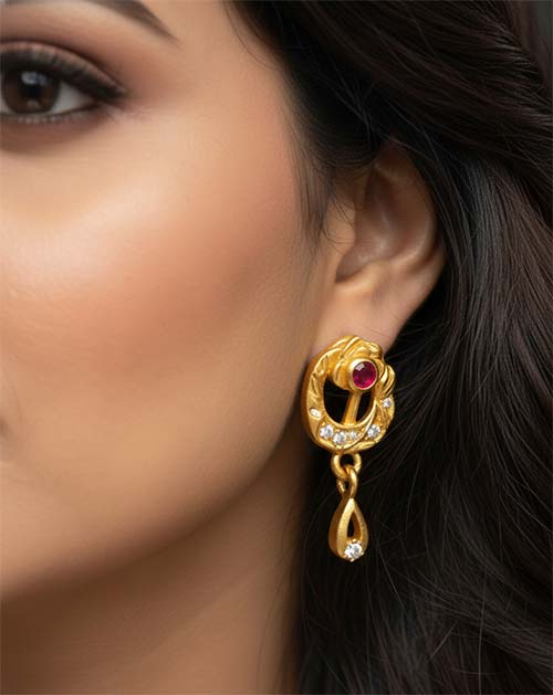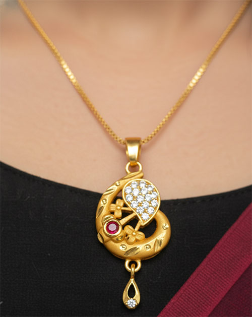 The mangalsutra features a beautifully designed floral curve pendant highlighted with sparkling stones and a subtle red stone accent, finished with a delicate drop. Paired with classic black beads and matching earrings, this set is perfect for office wear, and light festive occasions.