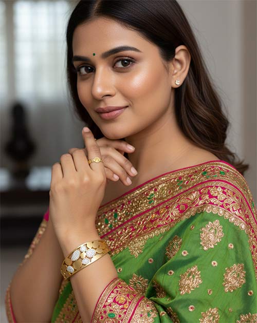 Add a touch of elegance to your jewellery collection with this Crystal Bloom Anti-Tarnish Gold Plated Bracelet. Designed with a wide cuff-style structure, this bracelet features a beautiful floral-inspired pattern highlighted with shimmering white crystals that create a luxurious statement look. Crafted from premium stainless steel and finished with high-quality gold plating, it offers long-lasting shine and excellent resistance to tarnish. Perfect for parties, festive occasions, celebrations, and special gatherings.