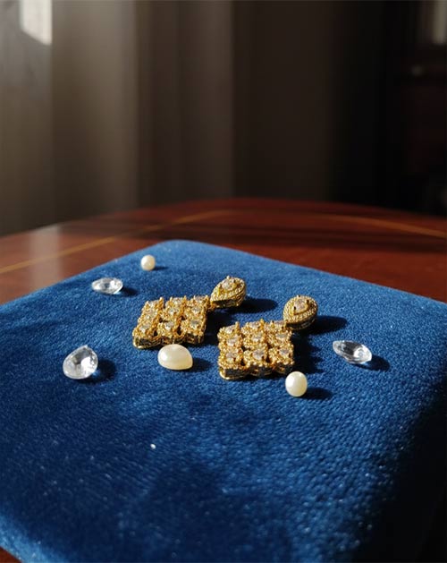 The gold-plated finish adds a rich and luxurious touch, while the carefully set stones create a refined balance of elegance and glamour. Made from durable alloy material, these artificial earrings are lightweight and comfortable, making them suitable for extended wear during special occasions.