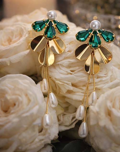 Add a touch of graceful elegance to your look with these Emerald Pearl Cascade Anti-Tarnish Gold Plated Earrings. Designed with radiant emerald-green crystal stones arranged in a floral pattern, these earrings are beautifully accented with soft pearl details and polished gold-tone petal elements. The cascading pearl drops create a fluid, eye-catching movement that enhances both traditional and contemporary outfits.