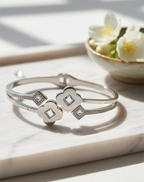 Add a touch of refined elegance to your jewellery collection with the Floral Motif Crystal Accent Anti-Tarnish Bracelet. Crafted from premium stainless steel, this bracelet showcases delicately designed floral elements highlighted with subtle crystal detailing, creating a balanced blend of charm and sophistication.