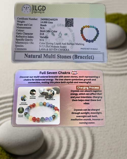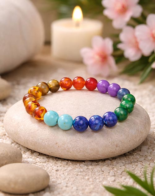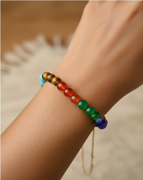 The Full Seven Chakra Bracelet is beautifully designed with colorful stones that represent all seven energy chakras of the body. Each bead symbolizes balance, positivity, and spiritual harmony. This bracelet is ideal for meditation, daily wear, and spiritual healing, while also serving as a stylish fashion accessory.