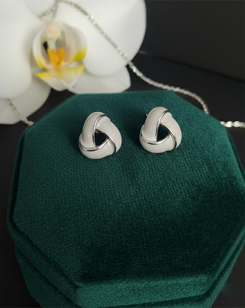 Ivory Knot Enamel Stud Earrings feature a refined interlocked knot design that symbolises elegance and connection. Crafted with a smooth ivory-white enamel finish and highlighted by a subtle silver-tone accent, these earrings bring a modern yet graceful touch to your jewellery collection.