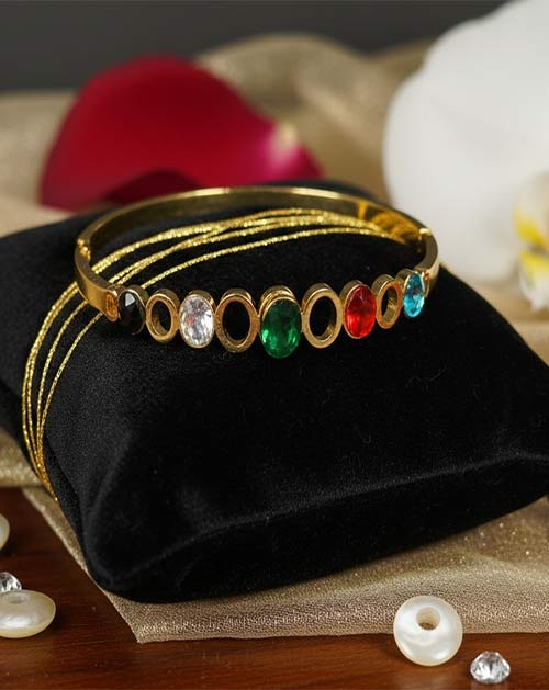 Add a touch of color and luxury to your jewellery collection with the Multicolor Crystal Circle Anti-Tarnish Gold Plated Bracelet. Crafted from premium stainless steel, this bracelet is enhanced with a rich anti-tarnish gold plating that delivers long-lasting shine and a refined finish.