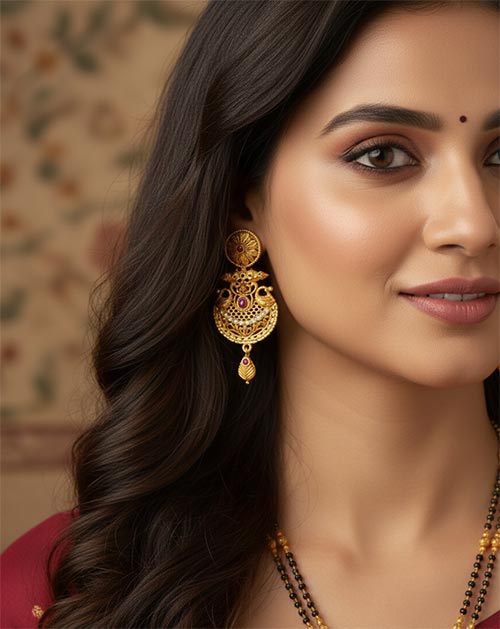 The mangalsutra showcases classic black beads paired with a beautifully detailed peacock-inspired pendant, accented with subtle stone embellishments. The matching earrings complete the look, making this set a perfect choice for weddings, festive occasions, and traditional celebrations.