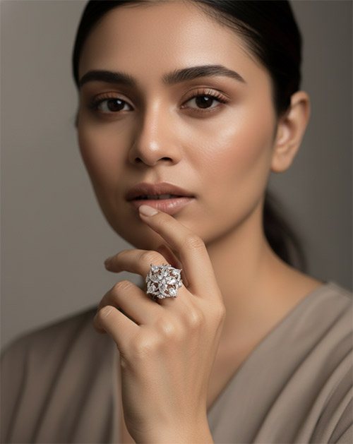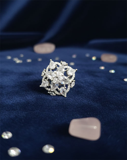 Crafted from high-quality alloy metal with a premium silver finish, this ring offers durability along with a brilliant shine. Its bold yet refined look makes it perfect for special occasions, parties, celebrations, and evening wear. The detailed craftsmanship and sparkling crystal arrangement make this ring a standout accessory for any jewellery collection.