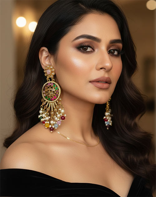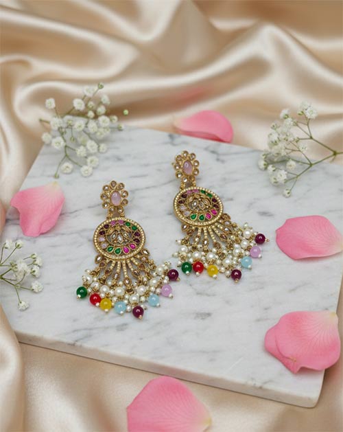These royal-style chandbali earrings feature an elegant light pink oval stone on the top, followed by a detailed circular floral design. The center is highlighted with multicolor stones in green, pink, and ruby tones, surrounded by fine pearl detailing. Finished with layered pearl and multicolor bead drops, these earrings offer a rich traditional look perfect for festive and ethnic styling.