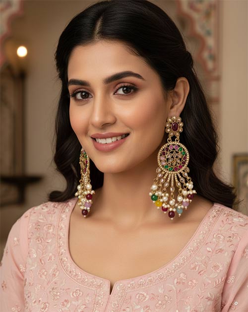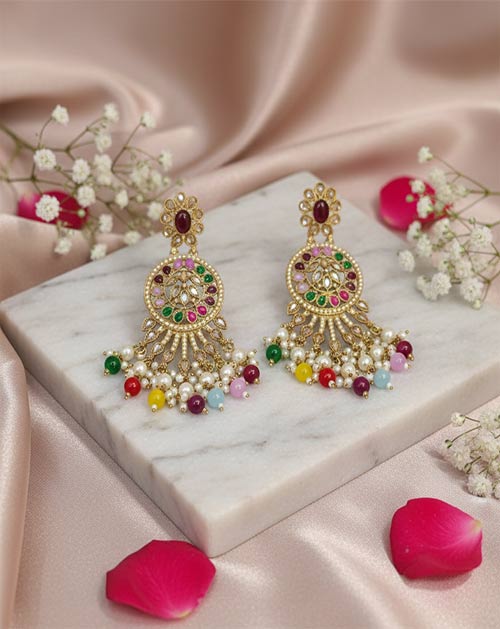 Designed with a bold ruby-colored oval stone at the top, these chandbali earrings showcase intricate floral craftsmanship. The circular centerpiece is adorned with multicolor stones and delicate pearl outlining, while the bottom features cascading pearl and bead drops for a graceful movement. A statement piece that adds royal charm to ethnic ensembles.