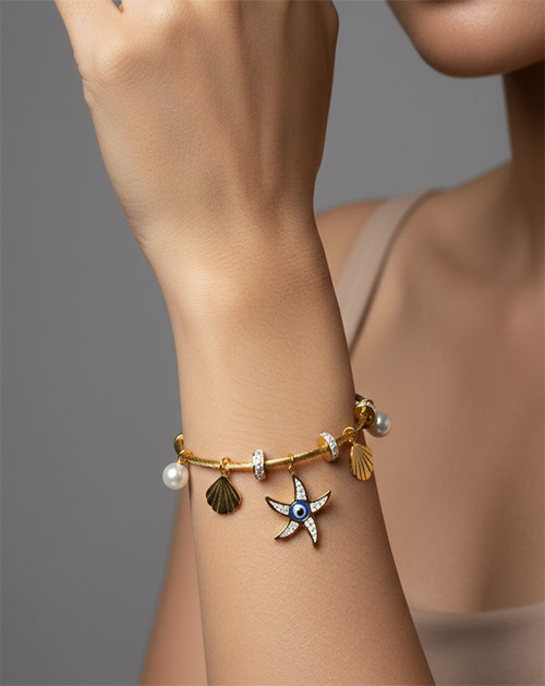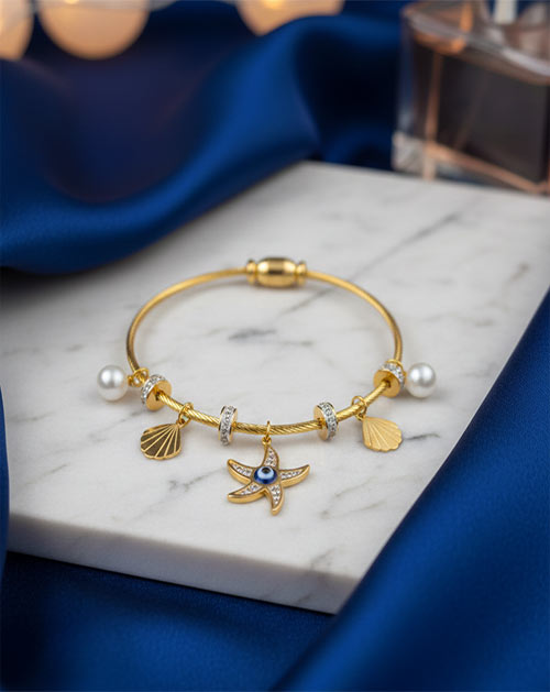 Elevate your jewellery collection with the Star Evil Eye Accent Anti-Tarnish Gold Plated Bracelet, a perfect blend of modern elegance and symbolic charm. Designed with a delicate star motif featuring an evil eye accent, this bracelet adds a stylish yet meaningful touch to your everyday and special looks. Crafted from premium stainless steel with high-quality gold plating, it offers long-lasting shine and resistance to tarnishing. Lightweight, skin-friendly, and comfortable to wear, this bracelet is ideal for women and girls who love subtle statement jewellery.