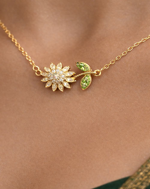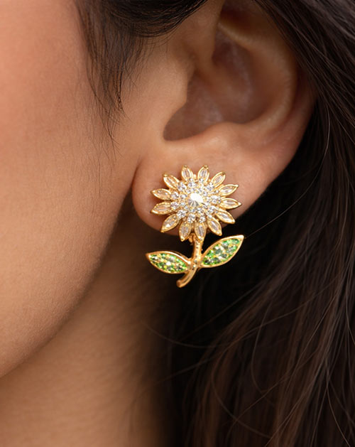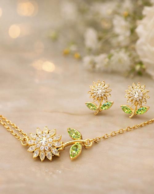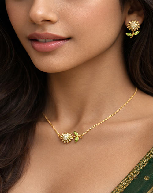 The delicate flower-shaped pendant is highlighted with sparkling stones and subtle green leaf accents, giving it a fresh and graceful look. The matching floral stud earrings complete the set beautifully, making it perfect for women who love minimal yet charming jewellery.