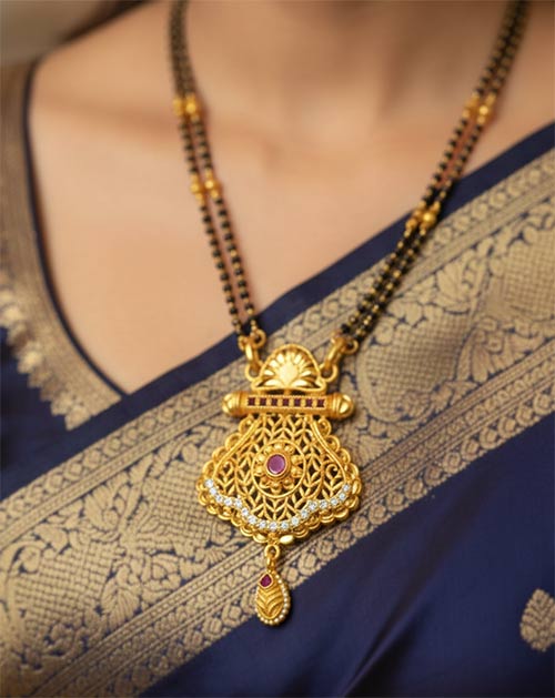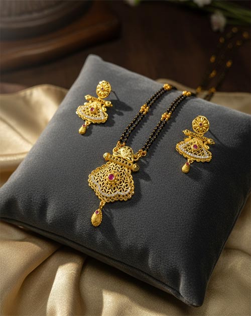 The mangalsutra features classic black beads paired with an intricately designed cutwork pendant, inspired by temple jewellery aesthetics. Subtle stone detailing and a high-polish finish enhance its heritage charm, while the matching earrings complete the coordinated traditional look—ideal for weddings, festive occasions, and cultural celebrations.