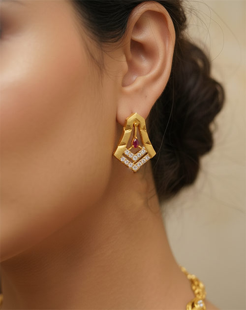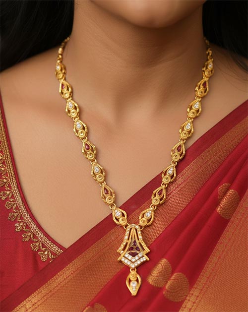 The necklace features intricate detailing with ruby-tone accents and a beautifully designed pendant, paired with matching earrings for a complete traditional look. Its lightweight yet durable construction makes it comfortable for long wear during weddings, festivals, poojas, and special occasions.