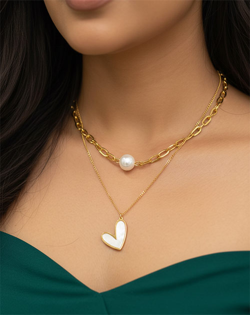 The highlight of the set is the white heart pendant that adds a soft romantic touch. Paired with sparkling statement earrings, a delicate heart-shaped ring, and a sleek bracelet, this combo is designed to suit both Festive wear and special occasions.